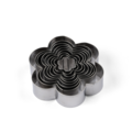 Kakformar 9-pack från Blomsterberg är tillverkade av rostfritt stål och formade som blommor med sex kronblad. Setet levereras praktiskt samlat i en stilfull plåtburk. Perfekt för att skära ut små bottnar till kakor, desserter, medaljbottnar, marsipanskyltar, småkakor och liknande, i flera olika storlekar.
