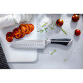 Svart santokukniv 31cm från GastroMax är en mångsidig kniv, perfekt för att hacka och skära grönsaker, kött och fisk. Det mönstrade bladet förhindrar att maten fastnar på kniven, vilket gör skärningen smidig och effektiv. Kniven är tillverkad av slitstarkt rostfritt stål och har ett non-slip handtag som ger ett säkert och bekvämt grepp under användning. Tål maskindisk, men handdisk rekommenderas för att behålla bladets skärpa längre.