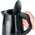 Vattenkokare från Severin. Svart vattenkokare i enklare utförande! som rymmer 1 L och har halkfria gummifötter. Ena sidan av vattenkokaren har ett transparent fönster som visar vattennivån.
