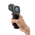 Infraröd lasertermometer från Hendi är designad för noggrann temperaturmätning med hög precision. Mätområdet sträcker sig från -32 till +400 °C, och termometern har en upplösning på 0,1 °C med en noggrannhet på cirka ±1,5 °C eller 1,5 %. Tack vare 12:1-förhållandet mellan mätavståndet och mätområdet kan du mäta små ytor på längre avstånd. Den har en praktisk "lock mode"-funktion för kontinuerlig temperaturövervakning, automatisk avstängning för att spara batteri, och drivs av ett inkluderat 9 V batteri.
