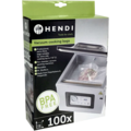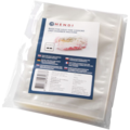 Vakuumpåse 100-pack från Hendi särskilt utformad för sous vide-matlagning. Påsen är 2-lagers med ett invändigt skikt av 60 µm livsmedelsgodkänd polyeten och ett ytterskikt av 15 µm polyamid (nylon), vilket ger en total tjocklek på 75 µm och fungerar som ett UV-filter.