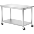 Arbetsbänk på hjul från Hendi. Bänken är tillverkad av rostfritt stål och är ttrustad vattentätlaminerad skiva för att förstärka uthållighet och dämpaljud. Arbetsbänken passar att användas i professionella kök där man behöver flytta runt arbetsytorna.