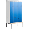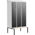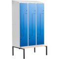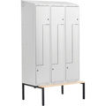 Z-skåp med bänkstativ är en perfekt lösning för mindre lokaler där skåp med enkeldörrar inte får plats. Med tre sektioner och sex fack är det praktiskt för att hänga upp kläder samt förvara till exempel väskor eller hjälmar. Skåpet är robust och välventilerat, och det levereras komplett med ett bänkstativ som gör det enkelt att hålla rent under skåpet.