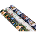 Julpapper förpackade i konsumentrullar för vidareförsäljning i er butik. En förpackning med julpappret innehåller 9 rullar med 3 olika mönster.