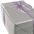 Presentpapper Hans har ränder i vit och silver som ger paketet ett stilrent intryck. Lägg till några lekfulla färger på presentsnören för fina paketinslagningar av gåvor och presenter.