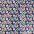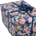 Presentpapper Marigold Blue med mörkblå bakgrund och stora dekorativa blommor i härliga rosa och lila färger. Pryd paketet med färgglada presentsnören för somriga paketinslagningar av gåvor och presenter.