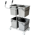Ett stativ av stålrör i pulverlackerad grå kulör med fyra länkhjul av grå gummibana med två styrbara handtag. En stabil och lätt sorteringsvagn -som kan placera i olika miljöer. Vagnen har plats för fyra plastkärl som gör det lättare att källsortera olika material.