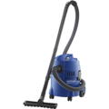 En blå dammsugare från Nilfisk, fungerar att både dammsuga vått och torrt. Den har ett smart klicksystem för att snabbt byta bland olika tillbehör.