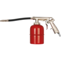 Sprutpistol med långt böjbart strålrör. Avsedd för tunna vätskor. Försedd med röd plåtbehållare. Strålbredden inställes med yttermunstycket.