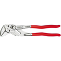Polygrip-/skiftnyckel-tång. Används med fördel som ersättning för skiftnyckel. Med parallellt spännande käftar och snabbinställning genom att trycka på inställningsknappen. Släta gripkäftar lämpade för skonsam montering av armaturer med förädlad yta. Käftarnas spel gör det möjligt att arbeta med tångnyckeln som en tång utan att ändra inställningen. Det smala huvudet ger ett säkert grepp även i trånga utrymmen. Av kromvanadinstål. Plastklädda skänklar.
