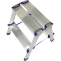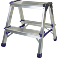 Stegstol med 2 steg tillverkad av aluminium och med en plattform i plåt som ger stegen stabilitet. En stabil trappstege som passar att använda inomhus för att nå högre upp.